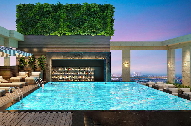 Relax and unwind in our stunning infinity swimming pool, offering a serene escape from the city's hustle and bustle. The pool area includes comfortable loungers and a Jacuzzi, providing the perfect place to relax and rejuvenate after a long day. With its edge seemingly blending into the horizon, our infinity pool creates a luxurious and tranquil atmosphere, making it an ideal spot to unwind and enjoy breathtaking views of the city skyline.
